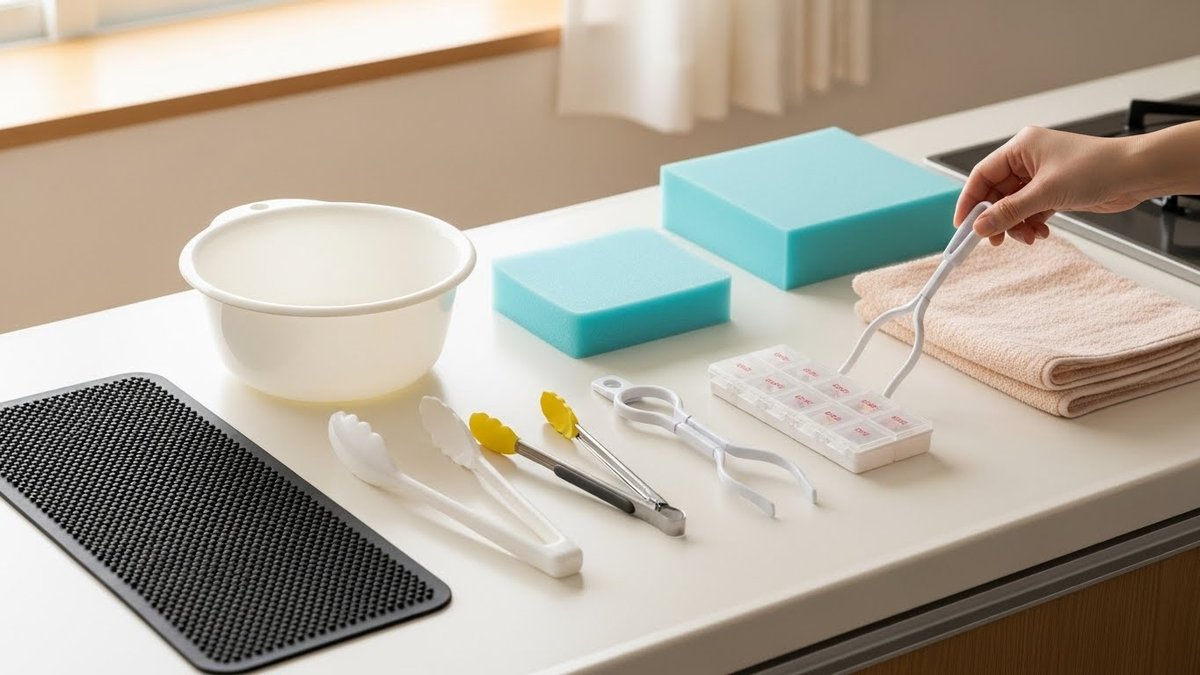 すぐに取り入れやすいのは、滑り止め付きのコップや持ち手付きのスプーン、軽量のプラスチック食器です。握りやすい形状や滑りにくい素材は食事の自立を助けます。キッチン周りの混乱を減らす整理トレーや小分けケースも便利です。