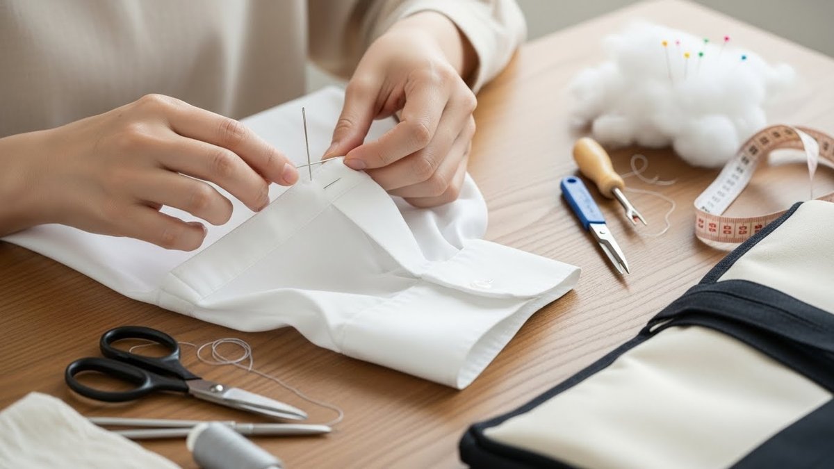 糸は基本色(白、黒、生成り)を揃えておくと多くのワイシャツに対応できます。印つけは洗えば消えるものが便利です。針山や指ぬきがあると作業が楽になります。